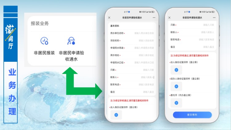 當用水施工完成,達到通水條件,用戶同樣可在“微網(wǎng)廳”中,辦理驗收通水申請,填寫相關(guān)信息,上傳附件,提交預(yù)約,后臺工作人員會主動聯(lián)系用戶,進行驗收通水。