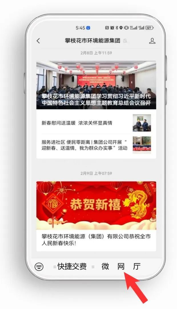 進入攀枝花市環(huán)境能源集團微信公眾號,點擊屏幕下方“微網(wǎng)廳”。