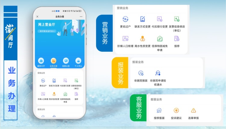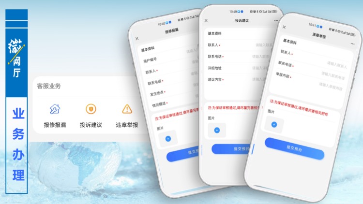 客服業(yè)務(wù)版塊主要是針對報修報漏,只要提交相關(guān)信息,工作人員會及時與用戶取得聯(lián)系進行處理。“微網(wǎng)廳”已開通投訴建議通道,對用戶提出的投訴和建議,將會第一時間進行回復(fù)和處理,同時歡迎大家對身邊的違章用水現(xiàn)象進行舉報。