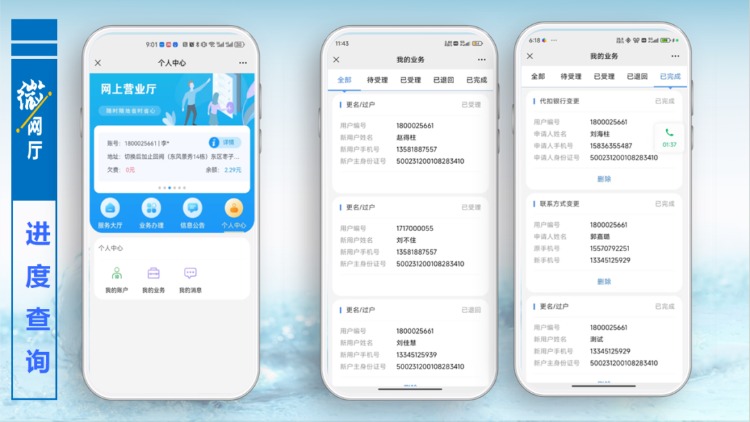 以更名過戶為例,用戶點擊更名過戶功能按鈕,進入提交資料界面,按照頁面提示,填寫相關(guān)信息和拍照上傳附件,提交預(yù)約,后臺管理人員審核通過,便完成更名過戶辦理,用戶無需再到營業(yè)大廳線下辦理任何手續(xù)。